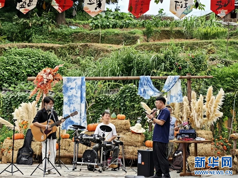 国庆中秋假期,岜沙苗寨驻唱乐队为游客表演歌曲。新华网发