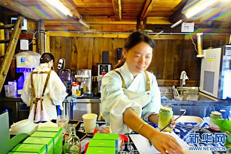 国庆中秋假期,身着传统服饰的云峰屯堡景区工作人员,正在为游客制作特色饮品。新华网发