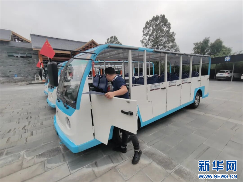 10月2日,岜沙苗寨观光车司机正进行发车前安全检查,整洁的车辆静候游客到来。新华网发