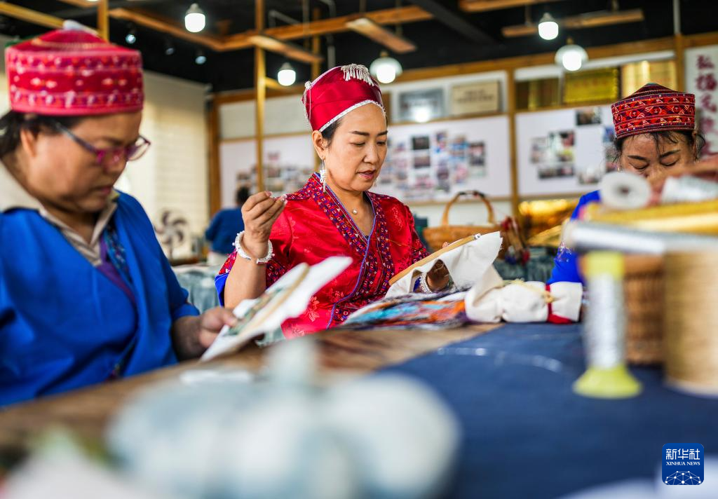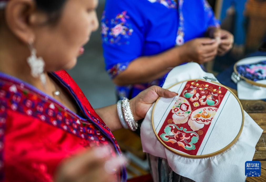 龙禄颖(中)在位于贵州省施秉县的舞水云台非遗工坊进行刺绣创作(10月10日摄)。新华社记者 陶亮 摄