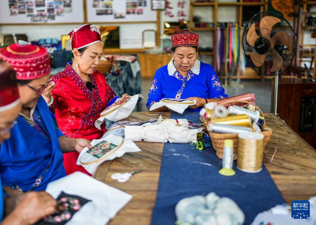 龙禄颖(左三)在位于贵州省施秉县的舞水云台非遗工坊进行刺绣创作(10月10日摄)。新华社记者 陶亮 摄