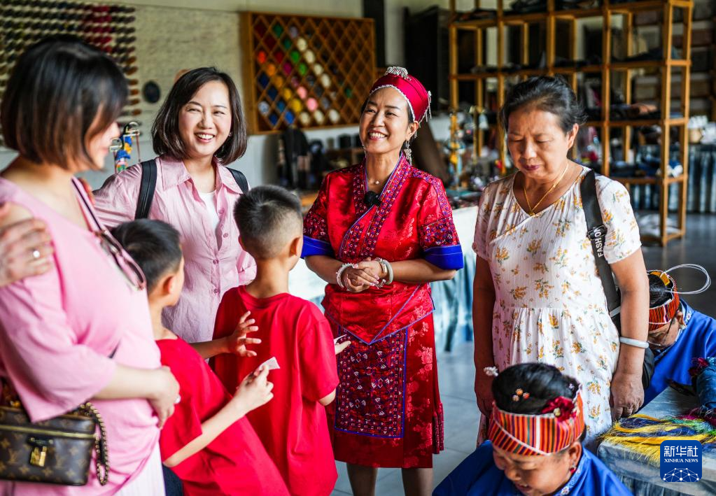 龙禄颖在位于贵州省施秉县的舞水云台非遗工坊和游客交流(10月10日摄)。新华社记者 陶亮 摄