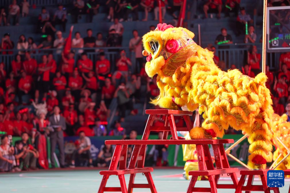 10月12日,演员在比赛前表演舞狮。新华社发(袁福洪 摄)