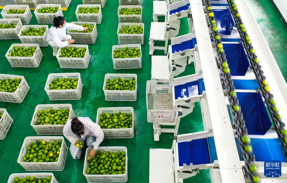 10月16日,工人在望谟县蔗香镇青柠檬现代产业园的生产车间分拣柠檬。新华社记者 杨文斌 摄