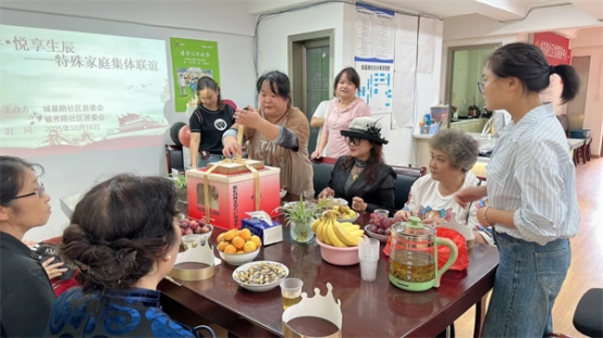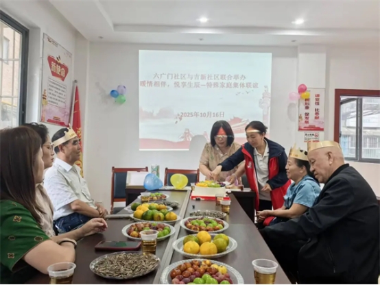 10月16日,六广门社区与吉新社区联合为辖区特殊家庭举办集体生日联谊活动。活动中,社区工作人员与志愿者为寿星戴上生日帽、送上定制蛋糕,并准备了实用的多功能电火锅作为生日礼物。大家围坐在一起许愿、切蛋糕、话家常,现场洋溢着温馨与感动。居民赵大爷动情地说:“平时家里冷清,今天有这么多人一起过生日,心里特别暖。谢谢社区一直惦记着我们!”