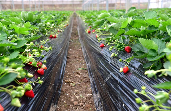 一垄垄翠绿的草莓植株整齐排列