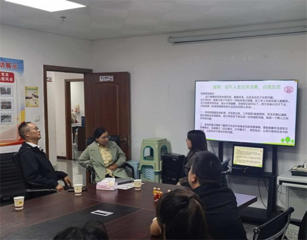 活动中,讲师聚焦当前婚恋家庭关系中常见的矛盾与问题,剖析婚恋纠纷产生的主要根源及特点,重点分享了有效沟通、情绪管理、矛盾缓冲及促进和解等方面的实用技巧与方法。为增强培训效果,咨询师们现场还原了一次真实案例的调解场景,直观展示了从“倾听共情”到“引导疏解”,再到促成矛盾双方相互理解、和解的全过程,为参与者带来了一场沉浸式学习体验,有效“激活”理论技巧,感悟“调解的艺术”。