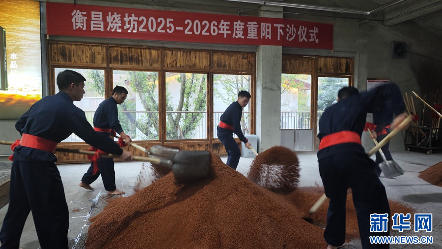 10月28日,衡昌烧坊的制酒工人在进行下沙作业。新华网 卢志佳 摄