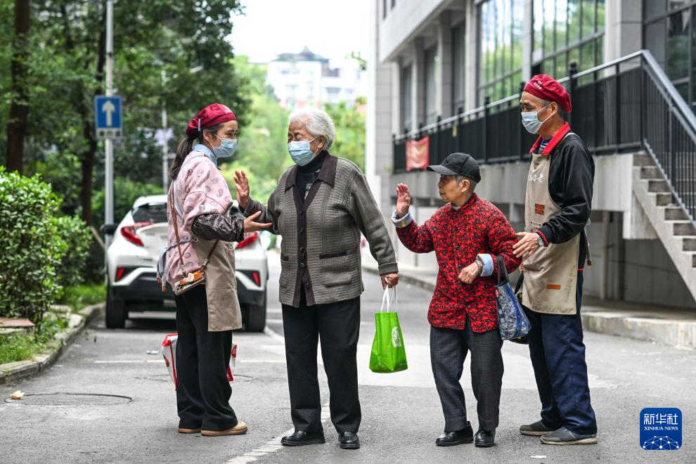 在贵阳市南明区红岩东郡社区,志愿者尹晓宣(左一)、王天能(右一)在给行动不便的老人上门送餐归来途中,与路遇的老人交流(10月24日摄)。