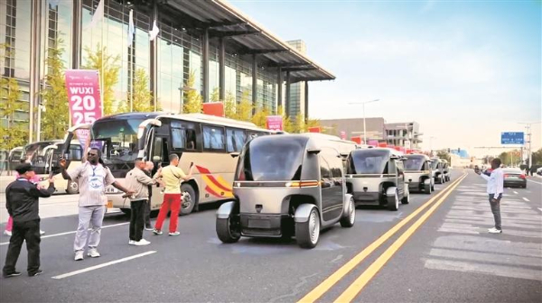 “看!这些车没有司机。”太湖国际博览中心广场上,一排圆润小巧的无人驾驶小巴正自如穿梭接驳乘客,吸引大批中外参展嘉宾乘坐体验,纷纷举起手机录像,惊叹不已。这款无人驾驶小巴搭载L4级自动驾驶技术,不分车头车尾、可双向移动,无驾驶舱、方向盘等传统部件,车身布满激光雷达、摄像头、超声波雷达等保障行车安全,被网友亲切称为“土豆巴士”。