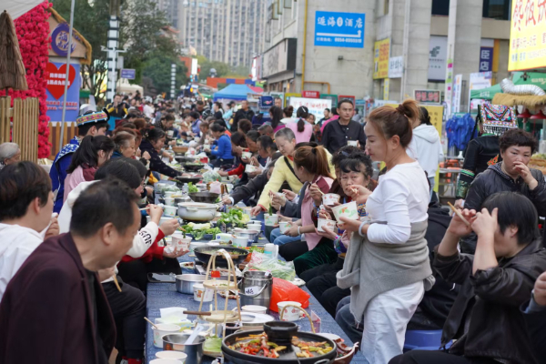 “长桌宴高山流水,把酒当歌,喝一杯唉喝一杯。”吹芦笙表演悠扬响起,苗家姑娘唱着悠扬的歌声捧上米酒迎接客人,各家商户纷纷亮出招牌菜:香辣烙锅热气升腾,烤全羊外焦里嫩香气四溢,烧椒牛肉鲜辣惹味,酸汤火锅酸香开胃。黔南州餐饮行业协会会长黄美能现场对长桌宴的饭菜及民族特色美食进行了专业点评与讲解,引导大家从“品尝味道”升华至“读懂文化”,深入理解民族美食作为文化载体所蕴含的深厚情感。