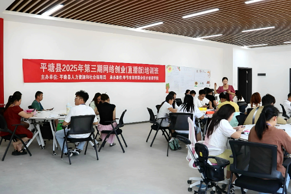 另一边的网络创业(直播版)培训班教室里,学员们全神贯注地跟随老师学习。镜头调试、话术设计、平台规则……老师结合案例细致讲解,学员们边记笔记边实操练习。家住掌布镇的杨贵祥在贵阳经营一家主营大健康产品和日用品的商贸公司,此次他带着两名员工一同来学习,希望借助直播更好地宣传产品、打开市场。杨贵祥说:“回去后,我们会运用所学知识试做直播,更好地推广大健康产品,让更多人了解我们的产品。”