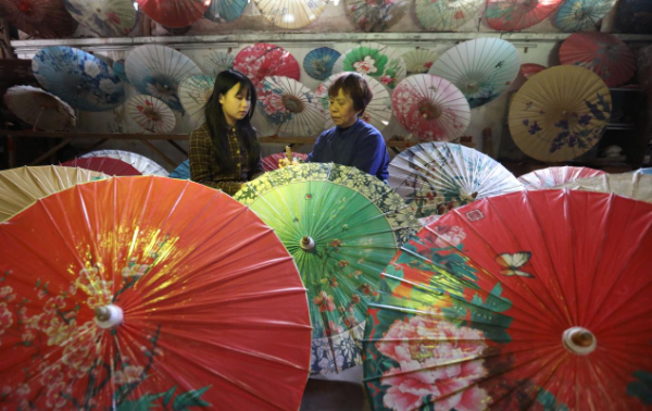 图为赤水油纸伞传承人李珍霞(右)在制作油纸伞