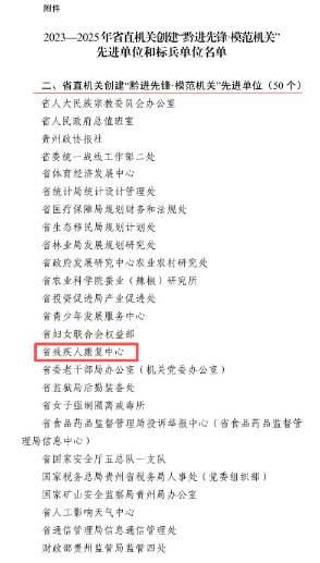 近日,中共贵州省直属机关工作委员会印发《关于命名2023-2025年省直机关创建“黔进先锋・模范机关”先进单位和标兵单位的决定》,贵州省残疾人康复中心凭借扎实的工作作风和突出的服务成效,荣获“黔进先锋・模范机关”先进单位称号!