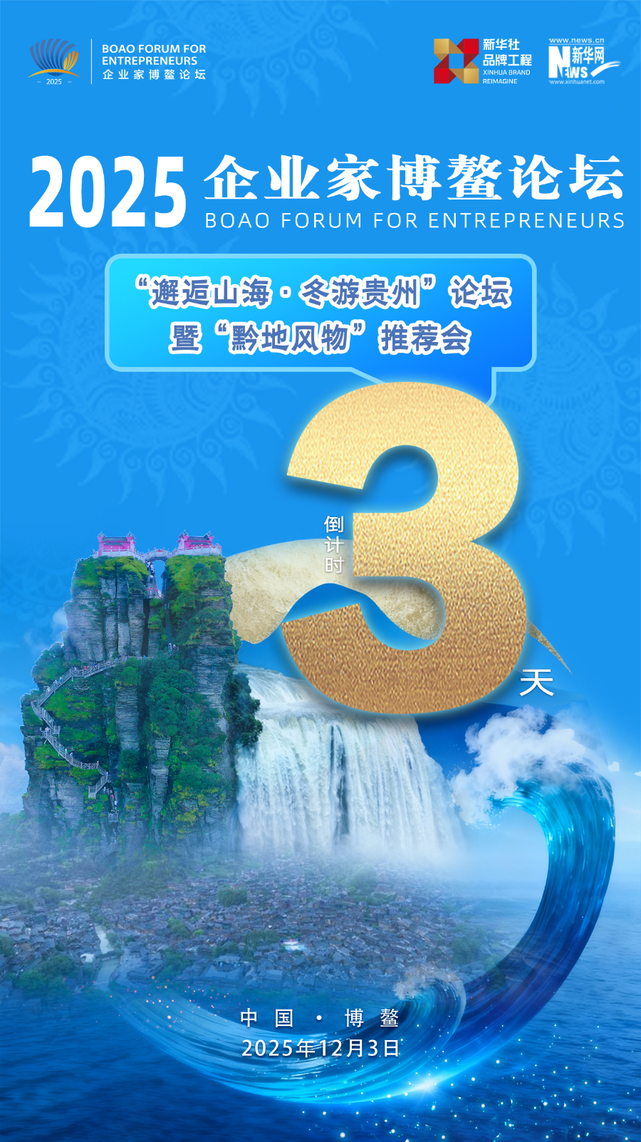 12月3日,由贵州省委宣传部指导,新华社品牌工作办公室、新华网、新华社贵州分社主办的2025企业家博鳌论坛之“邂逅山海·冬游贵州”论坛暨“黔地风物”推介会,将聚焦“山”与“海”的对话,推介“山地公园省 多彩贵州风”自然人文魅力、高品质旅游产品等,推进贵州与各地更深层次、更高水平交流与合作,助力贵州打造世界级旅游目的地。