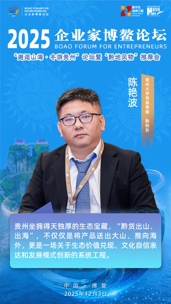12月3日,由贵州省委宣传部指导,新华社品牌工作办公室、新华网、新华社贵州分社主办的2025企业家博鳌论坛之“邂逅山海·冬游贵州”论坛暨“黔地风物”推介会在海南博鳌举办。贵州大学党委常委、副校长陈艳波出席论坛并作为圆桌对话主持人,与现场嘉宾一起探讨如何念好“山字经”,种好“摇钱树”,让深藏于绿水青山间的优质农产品和特色风物,走出大山,走向全国。