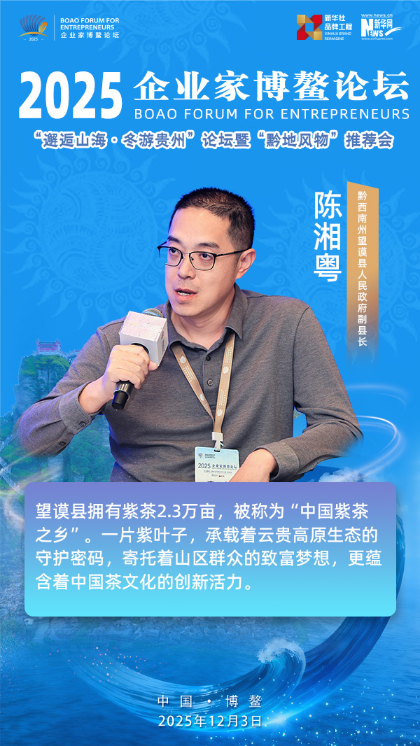 12月3日,由贵州省委宣传部指导,新华社品牌工作办公室、新华网、新华社贵州分社主办的2025企业家博鳌论坛之“邂逅山海·冬游贵州”论坛暨“黔地风物”推介会在海南博鳌举办。论坛现场,贵州省黔西南州望谟县副县长陈湘粤与参会嘉宾一起探讨如何让市场理解和认同望谟八步紫茶的“高价值”。