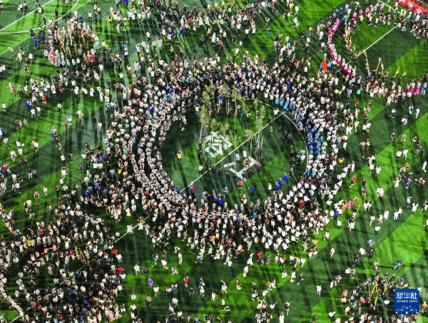8月23日,人们在贵州“村超”球场跳苗族芦笙舞(无人机照片)。新华社记者杨文斌 摄