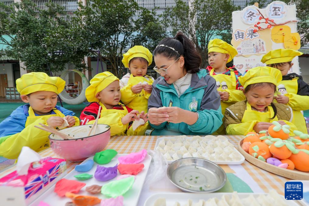 12月18日,在贵州省开阳县紫兴街道东湖幼儿园,小朋友在老师的指导下学习包饺子。