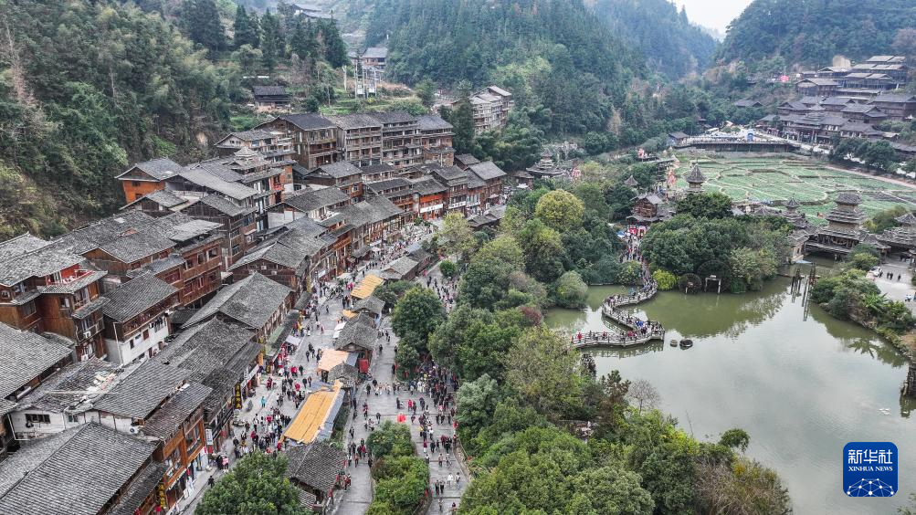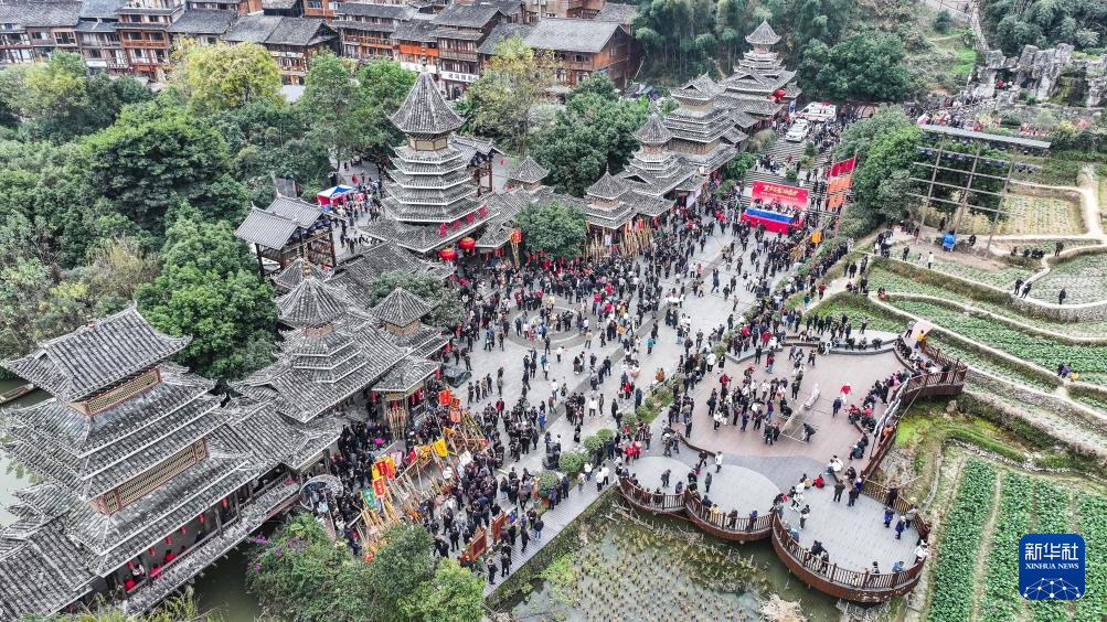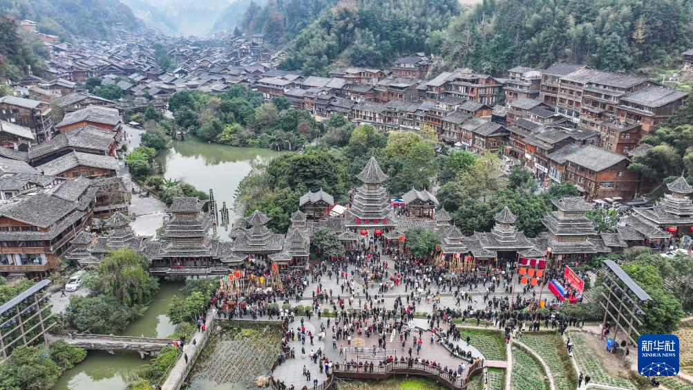12月20日,游客与侗族群众在肇兴侗寨正门欢庆侗年(无人机照片)。新华社记者 陶亮 摄
