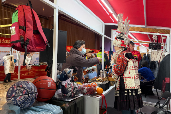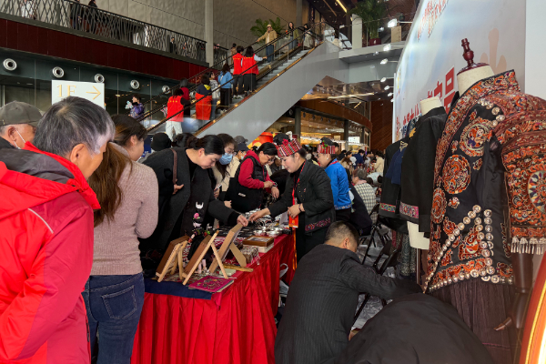 与此同时,惠民文化消费市集内人头攒动。苗族银饰、苗绣、蜡染等非遗手工艺品琳琅满目,巧夺天工的工艺让观众赞叹不已;“村BA”系列文创产品创意十足,将赛事活力与民族元素巧妙融合。特别值得一提的是,台江县以国家大剧院艺生活logo为核心,融合龙、蝴蝶、花鸟等苗族传统纹样,采用苗绣“绘”制了《苗韵艺华章》,以此祝福国家大剧院建院18周年;苗人匠心文化创意有限责任公司更联合国家大剧院,打造出涵盖5个品类20余款的系列文创产品,吸引众多首都观众争相选购,让大家在近距离观赏与体验中,感受台江非遗的传承魅力与文创产业的创新成果。