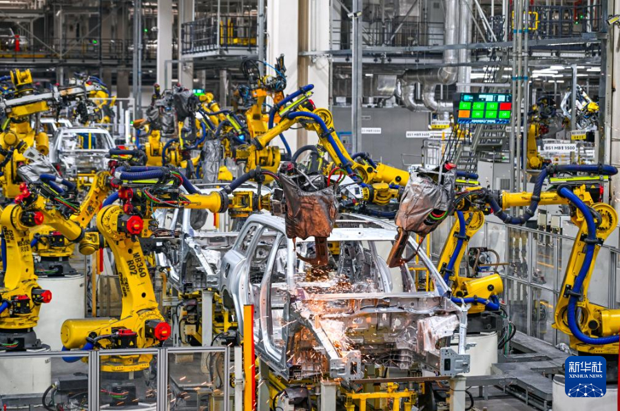 9月19日在位于重庆市两江新区的赛力斯汽车超级工厂拍摄的自动化生产作业现场(无人机照片)。新华社记者 王全超 摄