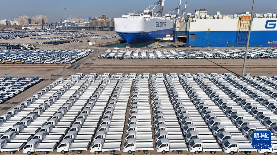 12月4日,汽车停在山东港口烟台港等待装船(无人机照片)。新华社发(唐克摄)