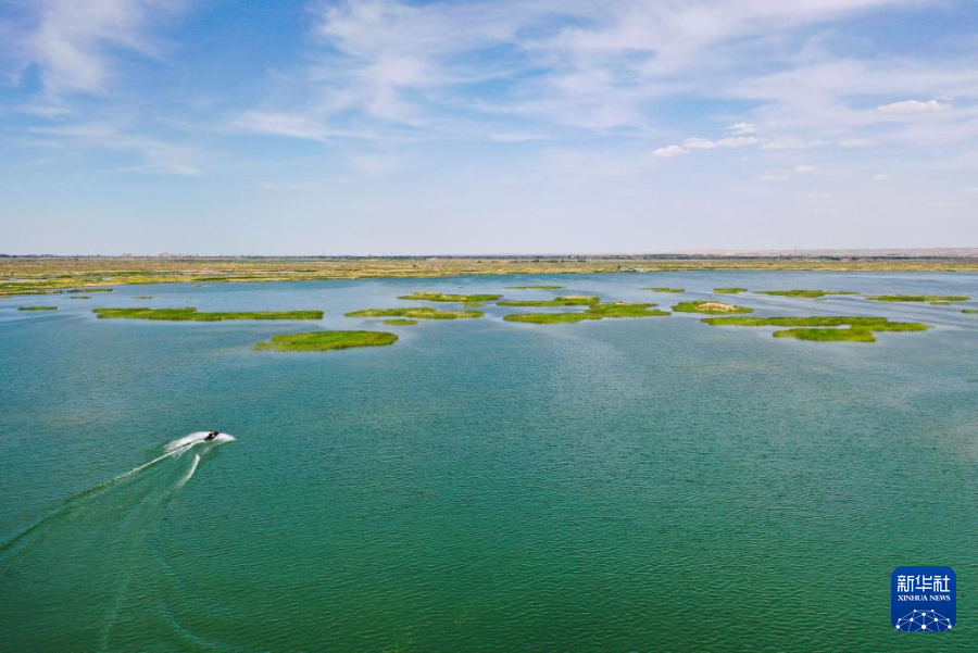 6月5日,在巴彦淖尔市磴口县奈伦湖国家湿地公园,摩托艇行驶在湖面上(无人机照片)。黄河“几字弯”逐渐展现“金沙蓝海绿洲”的美丽画卷。新华社记者 李志鹏 摄