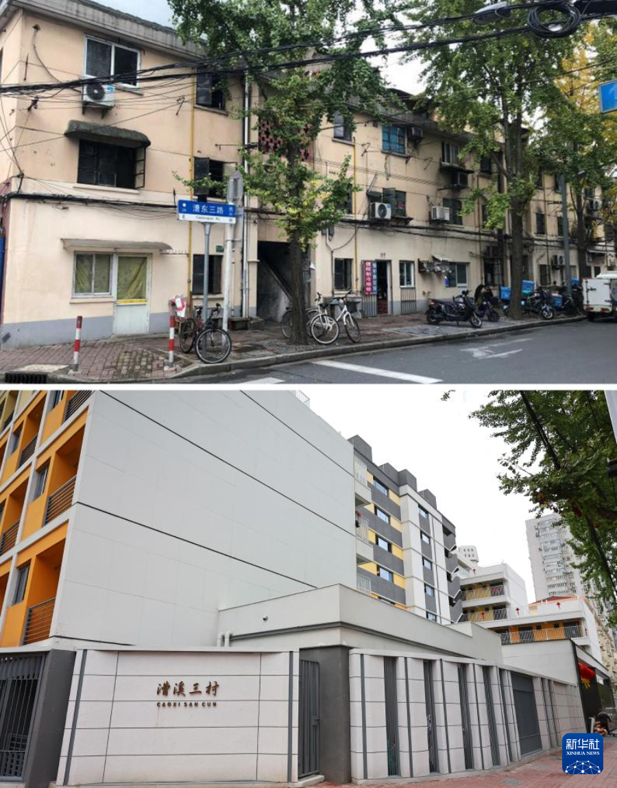 拼版照片:上图是改造前的漕溪三村小区居民楼外景(资料照片,新华社发);下图是拆除重建后的漕溪三村小区居民楼外景(10月23日摄,新华社记者方喆摄)。新华社发