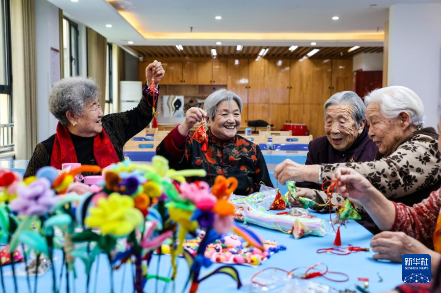 12月19日,在山东省乐陵市德乐怡嘉长者公寓,老人们在制作福袋包。新华社发(贾鹏摄)