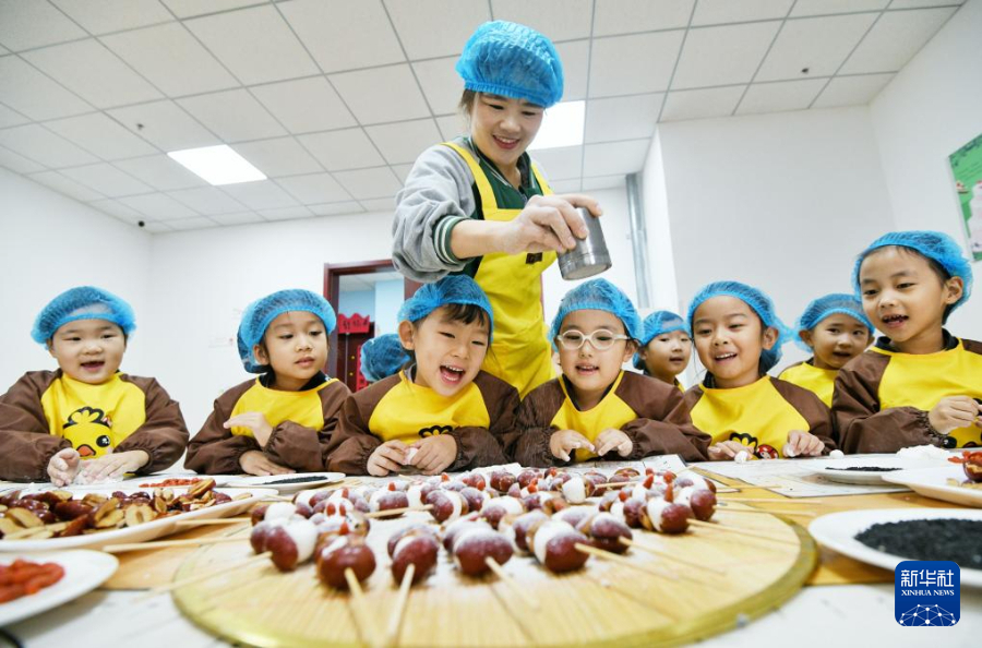 12月19日,在山东省乐陵市天和嘉园幼儿园,小朋友在老师的指导下做小枣面食。新华社发(刘振兴 摄)