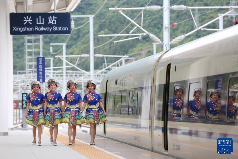 2022年6月20日,郑渝高铁实现全线贯通运营。这是在郑渝高铁兴山站,身着表演服的列车乘务员准备乘车为乘客表演节目。新华社发(杨东摄)