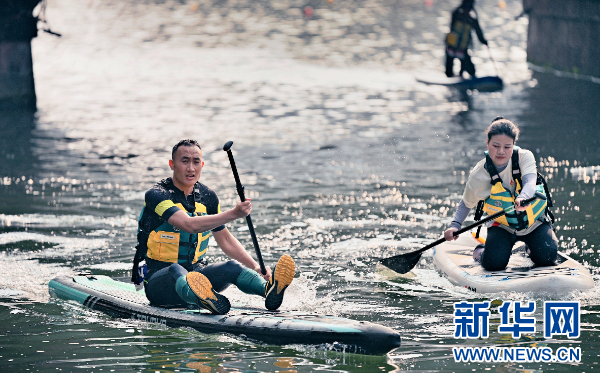 12月28日,选手们在湘江河上划桨板。(主办方供图)
