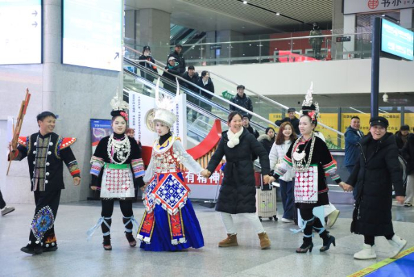 随着列车缓缓驶入贵阳北站,更多的惊喜还在上演。志愿者早已在出站口等候,为远道而来的客人送上礼物与祝福。与此同时,芦笙悠扬、舞步翩跹,精彩的民族歌舞表演赢得了旅客的阵阵掌声。