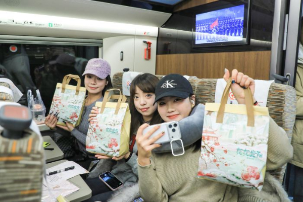 旅途中的惊喜接连不断。工作人员一边热情问候“欢迎来到贵阳!祝您跨年愉快”,一边为乘客送上精心准备的“宠粉礼包”,礼包内不仅有刺梨汁、土豆片等贵州特色食品,还贴心地配备了多种消费代金券。“这份礼物太让人惊喜了,贵阳真是一座热情又温暖的城市!”来自浙江的游客郑路婕接过礼包,脸上洋溢着笑容。