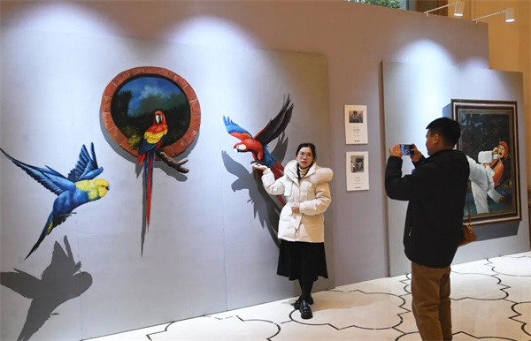 1月2日,在贵阳花果园国际文化艺术交流中心,市民游客正在3D魔幻艺术展区拍照打卡。