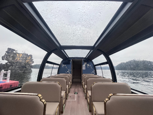 笔者在松林坡码头看到,3艘崭新的电动船舶整装待发。船舶通体设计极具科技感,大面积全景天窗贯穿船体,成为亮眼吸睛的视觉焦点。步入船舱,座椅沿两侧整齐排列,游客靠窗而坐,碧波荡漾的湖面风光可尽收眼底,沉浸式游湖体验拉满。