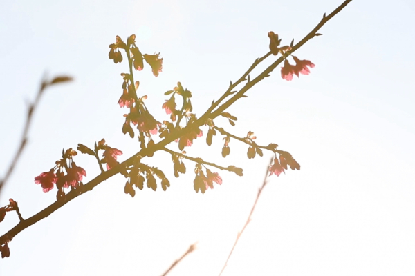 阳光下樱花含苞欲放。