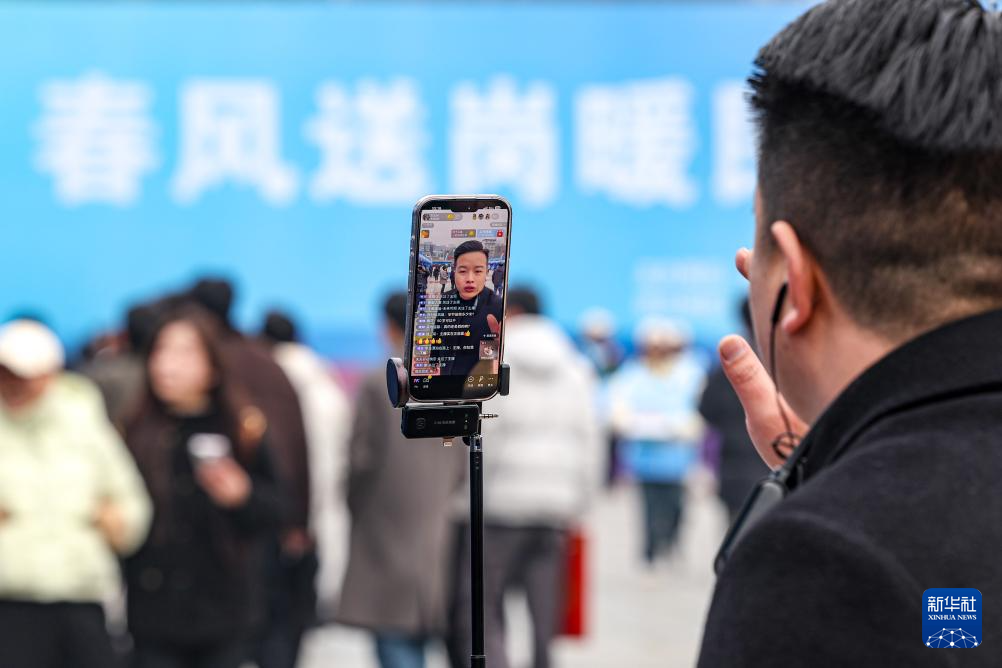 1月16日,工作人员在贵州省2026年“春风行动”暨五省联动就业服务季活动现场进行直播带岗。新华社发(陈曦 摄)