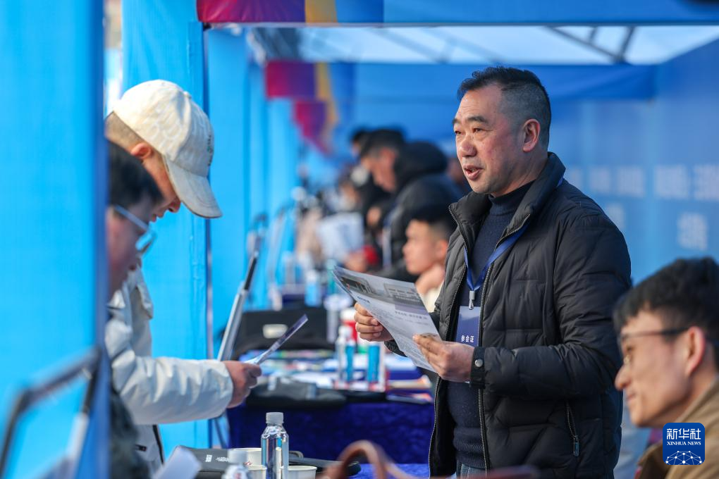 1月16日,工作人员在贵州省2026年“春风行动”暨五省联动就业服务季活动现场介绍招聘信息。新华社发(陈曦 摄)