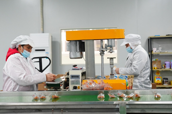 走进美洋洋食品有限公司生产车间,生产线正有序运转,工人们忙碌地进行配料、包装、质检等工作。车间内一派繁忙景象,一批批成品被打包、装箱,准备发往各地。