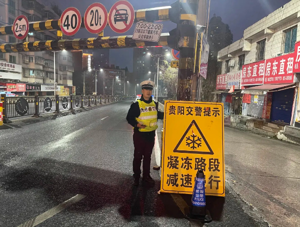 随着强冷空气来袭,云岩交警便提前做好抗凝冻物防、技防、人防工作。“我们经过排查,提前确定43处重点易凝冻点位,并规范摆放警示标牌43块、反光锥桶300多个,在桥梁、坡道、风口等关键点位安装7台温度传感器,通过手机端远程、实时监测路面温度与结冰状况。”区交管分局相关负责人介绍,为了确保道路畅通,该局启动了高等级勤务模式,对易凝冻点位及路段实行定人定岗定责,实行24小时不间断巡查值守。