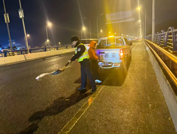 1月20日晚,贵阳市交管局云岩区分局民警走上街头,冒着风寒巡逻值守在辖区内易凝冻路段,对隧道出口、长下坡、高架桥、急弯陡坡等路段进行现场勘查,并根据道路实际情况采取压缩车道、亮灯警示等预防性措施,对易凝冻路段采取预防性撒盐措施,全面强化夜间巡逻工作,切实保障市民出行安全。