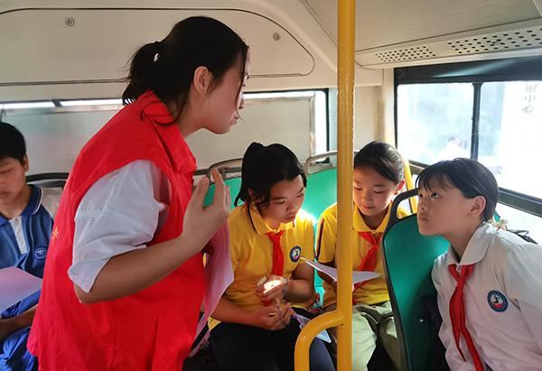 金沙公路管理段青年志愿者向学生宣传绿色出行理念和知识。(吴旭丹 摄)