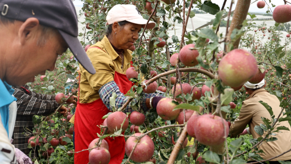 毕节市威宁自治县牛棚苹果种植基地,当地村民正在采摘苹果。
