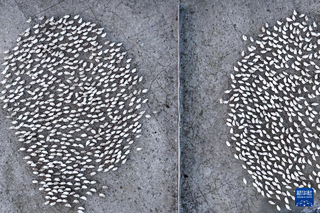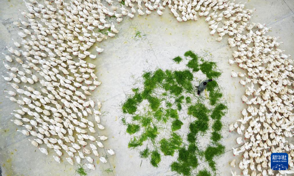 工人在贵州省锦屏县铜鼓镇马台生态种鹅养殖基地投放草料(2020年3月11日摄,无人机照片)。新华社记者 杨文斌 摄