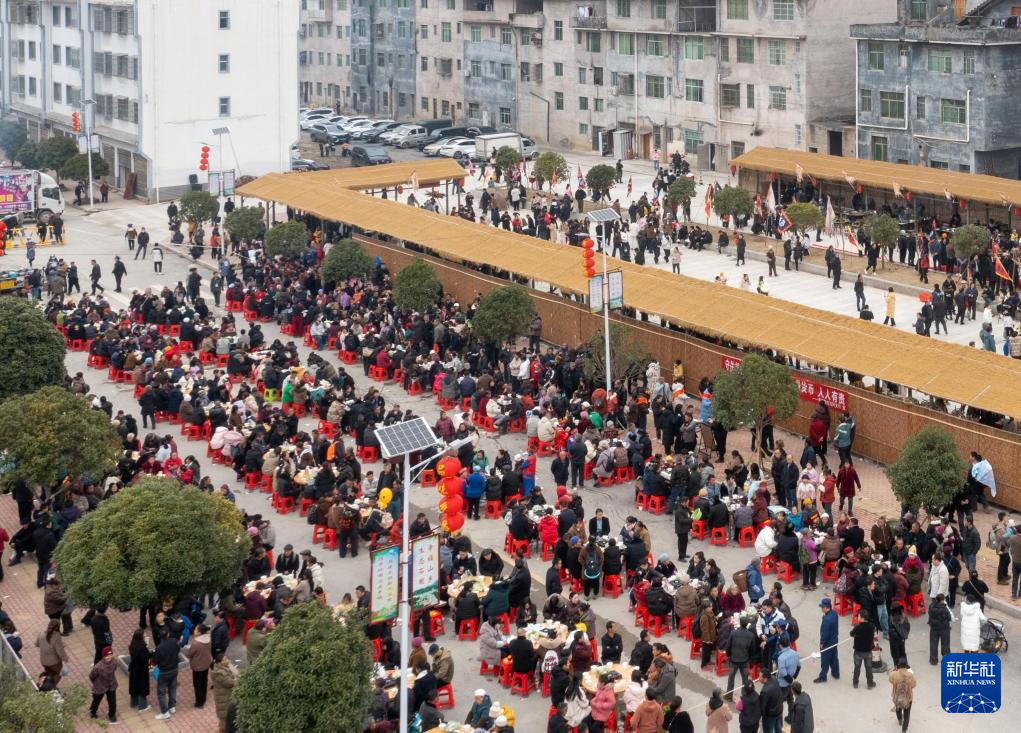 人们在“乡厨”大赛现场吃刨汤宴(无人机照片)。新华社发(杨坤 摄)
