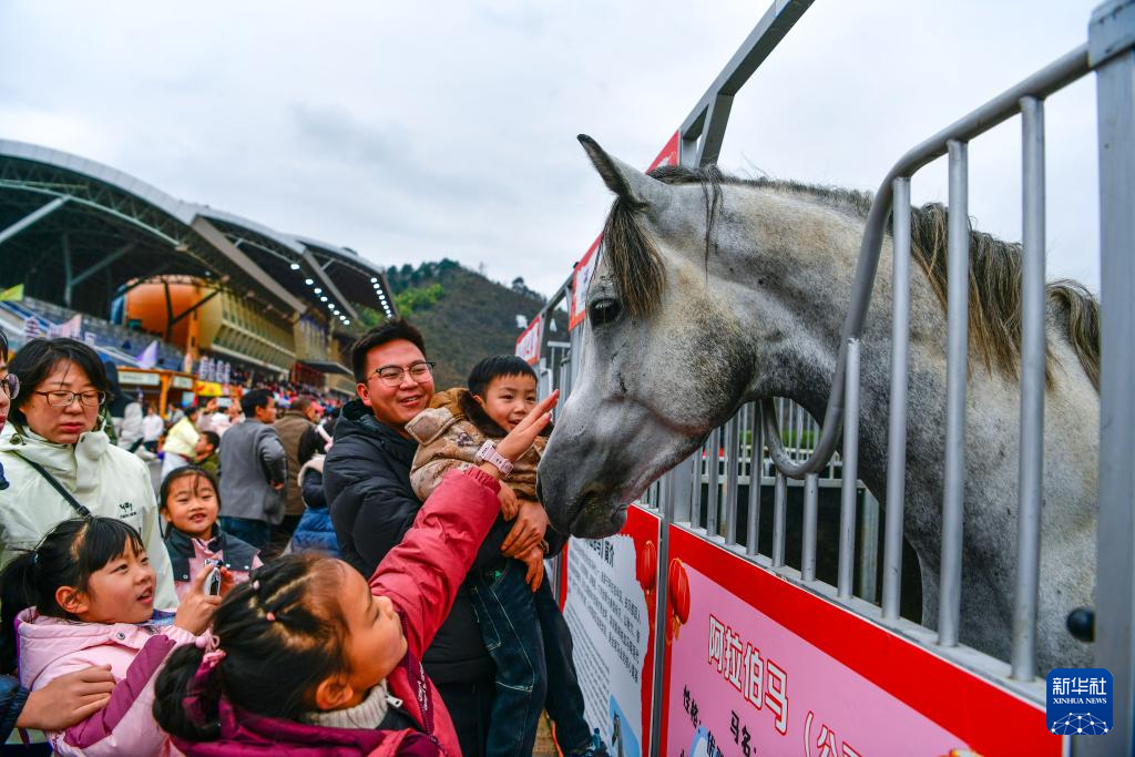 2026年“贵州村马”全国赛马邀请赛现场,孩子们在与马匹互动。新华社记者 杨文斌 摄。