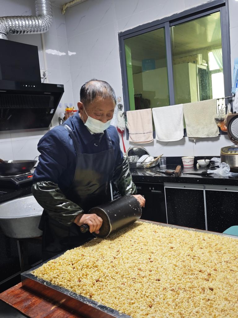 柴火灶、老铁锅、菜籽油、珍珠花生、手工麦芽糖……在彭应发的仓库和制作间,记者看到了这些“老品种”。他两手推动大约20斤重的滚筒,将拌匀的麻饼反复碾压定型。