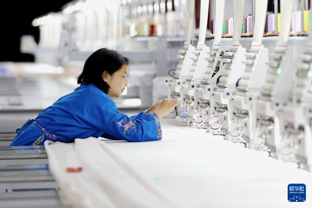 2月24日,工人在贵州省黔东南苗族侗族自治州施秉县一家数字化苗绣企业生产车间赶制订单产品。